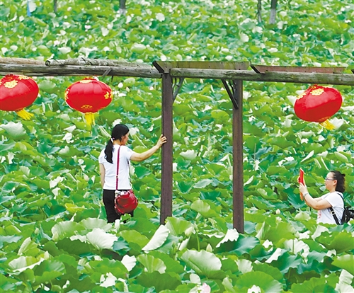 夏日观荷,各地不同特色的荷花主题活动丰富多彩,荷花艺术节、荷花美食节、荷花旅游节等纷纷举办。荷花公社亲子牧场、荷花宴荷系菜肴、打荷叶伞品荷叶茶,成就了不少景区的旅游黄金季。在安徽省肥东县建华社区的荷塘里,千亩荷花开放,游客纳凉赏荷,满满的夏意。