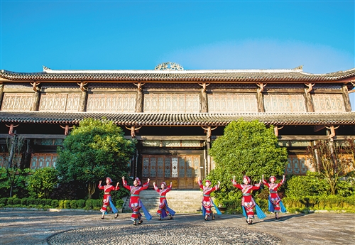 贵州省大方县奢香博物馆里,彝族风格的排舞创编工作组正在进行舞蹈作品录制。