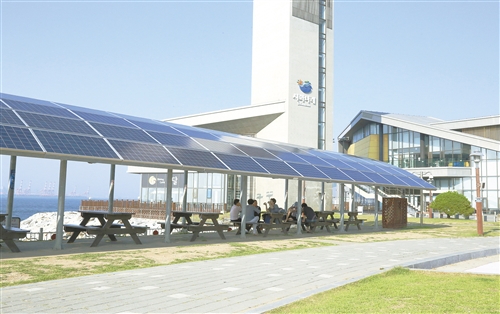 近期,韩国出现持续高温炎热天气,国内用电量不断刷新峰值。韩国国内出现了因电力供不应求导致大规模停电的担忧。图为韩国京畿道某发电厂设计的“太阳能发电板凉亭”,休闲、发电两不误。 本报记者 白云飞摄