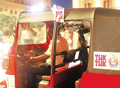 斯里兰卡“旅游友好突突计划”日前在科伦坡举行启动仪式,十几名“突突车”司机代表领取了培训结业证和导游证。“突突车”是斯里兰卡最流行的一种交通工具,通过该计划,“突突车”司机将分批接受培训,成为正式注册的导游,提升斯里兰卡的旅游服务质量。图为一名“突突车”司机准备上路迎接乘客。 (新华社发)