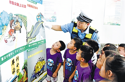 8月3日,河北省邢台市宁晋县交警为孩子们讲解交通安全知识。暑假期间,宁晋县公安局交警大队组织开展了“暑期安全 护童成长”主题教育活动,通过识别交通指示标志、学习交通指挥手势等,让少年儿童了解交通安全知识,提升他们的交通安全防范意识。赵永辉摄