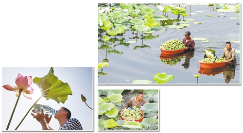 炎炎烈日,当您惬意地品尝着莲子时,是否想到采莲人付出的艰辛? 蔡保春是江苏盱眙县黄花塘镇芦沟村农民。8月18日,他拿着编织袋来到家门口的老营莲藕种植基地,行走在淤泥中,穿行在近2米高的荷叶间采摘莲蓬。不到10分钟,他已汗流浃背、气喘吁吁。为了不被莲梗的硬刺刺伤,他还得穿着胶靴、水衣、长袖工作服。 黄花塘镇老营莲藕种植基地占地2000亩,莲蓬采摘从每年7月份开始,一直持续到9月份。和蔡保春一样,村里的采莲工人一般都是天刚亮就下田,接近中午时收工。 采莲工人都是当地农民。蔡保春说,村民们将田地流转给企业后,不仅有流转收入,还可在企业务工赚钱。一天工作约6小时,人均采摘100公斤莲蓬,可收入150余元。
