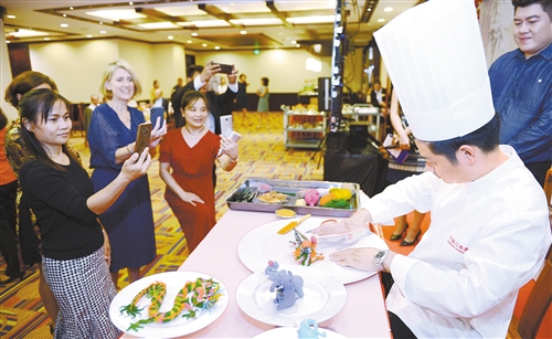 为庆祝中国传统佳节中秋节,同时作为中方积极参与2018老挝旅游年的重要活动,由中国文化和旅游部、中国驻老挝大使馆、老挝中国文化中心及浙江省文化厅共同举办的“舌尖上的中国——江南美食工作坊”活动日前在万象举行。图为一位厨师表演中国传统“米塑”技艺。(新华社发)