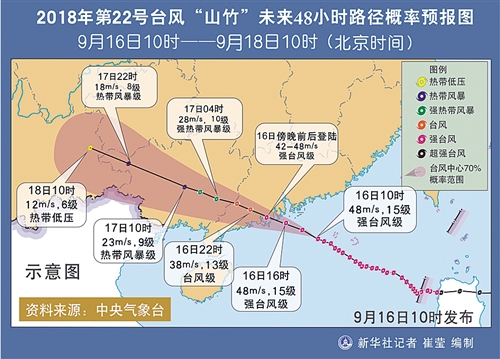 本报北京9月16日讯 记者常理 齐慧 郭静原报道:今年第22号台风“山竹”于16日17时在广东台山海宴镇登陆,预计“山竹”将继续向西偏北方向移动,强度逐渐减弱,影响广东、广西、云南、贵州等地。