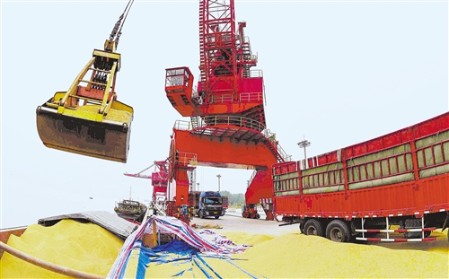 9月22日,在安徽省马鞍山市郑蒲港码头,工人利用卸船机进行装粮作业。当日是中秋假期第一天,众多劳动者在岗位上度过假期。刘勤利摄