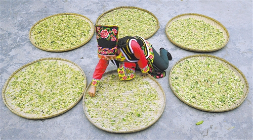 9月23日,四川省北川县陈家坝乡四坪村,羌族妇女在晾晒蔬菜。建设银行绵阳市分行通过无偿提供资金贷款和技术服务,助力当地农民脱贫致富。 杜炳勋摄 |