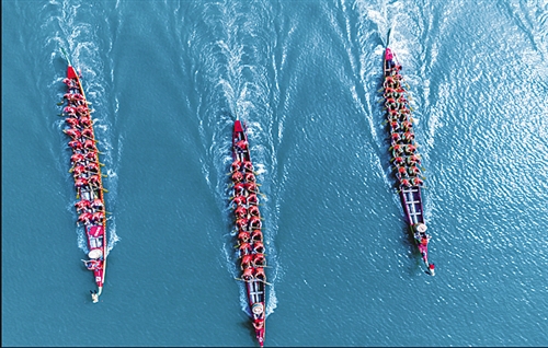 龙舟竞夏 饶颐摄于安徽省池州市。 ◀点评:龙舟竞赛是初夏各地传统文化体育项目,龙舟在碧波里竞技,动感十足。 |