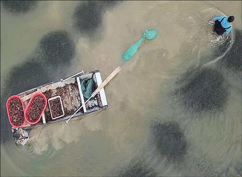 铜 奖 龙虾丰收 周海军摄于江苏省淮安市盱眙县。 ◀点评:对角线构图,俯视自然与人融为一体,彰显人水相依,共生共存。 |