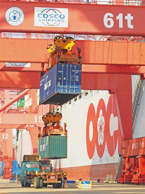 10月12日,轮船在江苏连云港港口集装箱码头装卸集装箱。海关总署当日发布的数据显示,2018年前三季度,我国货物贸易进出口总值22.28万亿元人民币,比去年同期增长9.9%。耿玉和摄