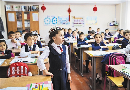 塔吉克斯坦杜尚别101学校是由中国特变电工股份有限公司出资援建的四所“中塔友谊学校”之一。杜尚别101学校的建成解决了塔国教育资源、教育场地极度短缺问题,成为中塔友谊的象征,图为学生在杜尚别101学校内上课。 (新华社发)