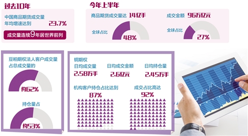 过去10年,中国商品期货成交量年均增速达到23.7%,成交量连续9年居世界前列。今年上半年,商品期货成交量达14亿手,全球占比为48%;持仓量1439万手,全球占比18.7%;成交金额96万亿元,全球占比27%。市场规模的稳步增长,使我国期货衍生品市场正在逐步发展成为全球重要的风险管理市场,成为中国特色社会主义市场经济不可或缺的组成部分。
