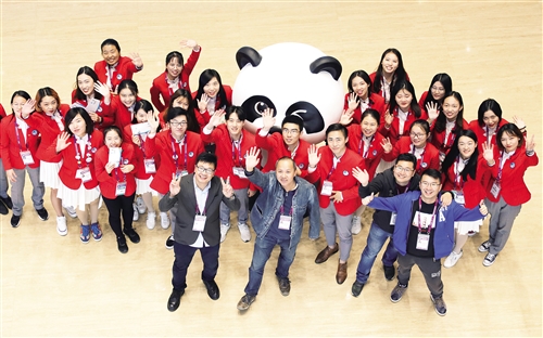十一月十日,志愿者们在进博会新闻中心与吉祥物“进宝”合影。当日,首届中国国际进口博览会在上海闭幕。 本报记者 高兴贵摄
