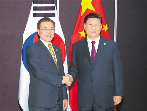 习近平指出,过去一年,朝鲜半岛形势出现积极变化。半岛问题总体上回到对话协商的正确轨道。事实证明,我们的努力是有成效的。在总统先生领导下,韩方致力于推动缓和半岛紧张、开展南北和解互动。中方支持南北双方不断改善相互关系。当前,半岛形势处在关键阶段。中韩要加强沟通,协调推进半岛无核化和建立半岛和平机制的进程。关键是有关各方相向而行,显示灵活,能够谈下去,谈出成果。