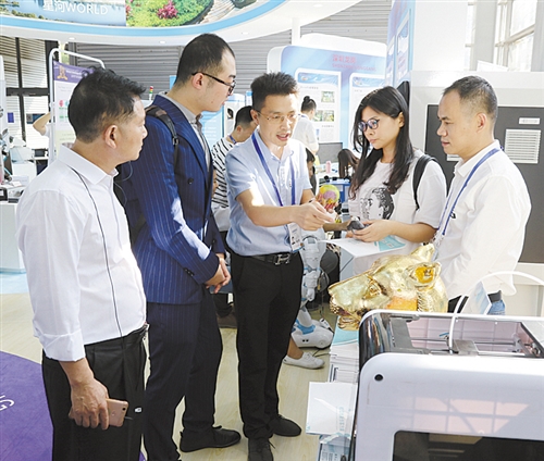 第二十届高交会上,深圳市巨影三维设备有限公司首次发布全新工艺技术的桌面全彩3D打印机。图为公司负责人(中)在介绍新技术。本报记者 杨阳腾摄