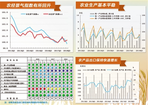 中经农业经济景气监测预警结果显示,2018年三季度,中经农业经济景气指数为100.3,比二季度回升0.2点,比去年同期高0.4点。中经农业经济预警指数为90.0,与二季度持平,仍保持在“绿灯区”运行。前三季度,夏粮收成较好,秋粮有望获得好收成,农业生产基本平稳;农业劳动生产率持续快速增长;财政农林水支出增速有所回升;农业出口和投资增速略有放缓,受成本上升影响,农民务农收入增速有所回落。