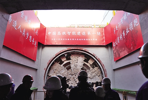 11月20日,“天佑号”盾构机刀盘从京张高铁清华园隧道洞内顶出。当日,由中铁十四局集团负责施工的京张高铁清华园隧道顺利贯通。清华园隧道是目前北京市内最大直径的盾构隧道,为京张高铁的控制性工程,开挖直径12.64米,全长6.02公里。它的贯通为2019年底京张高铁全线通车创造了有利条件。 本报记者 高兴贵摄
