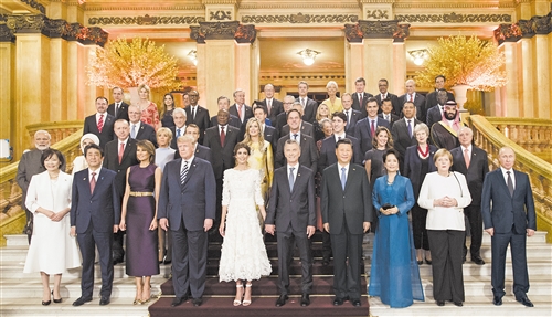 当地时间十一月三十日,二十国集团领导人第十三次峰会在阿根廷布宜诺斯艾利斯举行。当晚,国家主席习近平和夫人彭丽媛同出席峰会的各代表团团长夫妇集体合影。