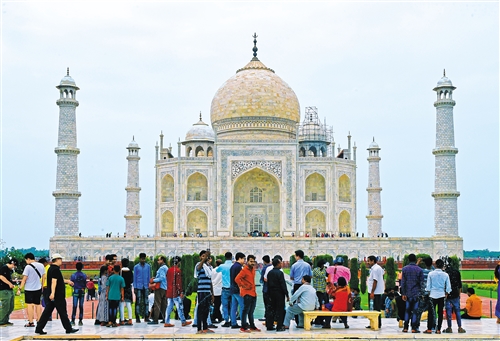 印度文化部下属考古调查局2018年12月10日宣布,从当日起将印度最负盛名的旅游胜地——泰姬陵门票价格统一上调200卢比(1元人民币约合10.3印度卢比)。调价后,泰姬陵的门票价格印度国内游客每人250卢比,外国游客每人1300卢比,来自南亚区域合作联盟国家的游客每人740卢比。印度政府希望用提价的手段限制客流,以保护泰姬陵。图为人们在泰姬陵参观。新华社记者 张迺杰摄