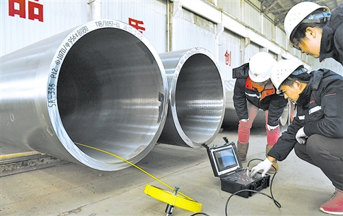 12月19日,河北省盐山县宏润核装公司的技术人员在检测用于核电站主蒸汽管道的1070毫米口径无缝钢管。该产品是目前采用锻挤压成形工艺生产的最大口径钢管,打破了国外产品的高价垄断。傅新春摄
