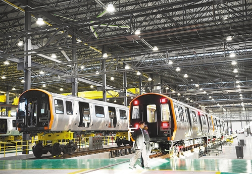 中国中车股份有限公司(中车)在美国马萨诸塞州斯普林菲尔德工厂生产的首批地铁车辆日前下线,这批车辆将被运往波士顿,交付给马萨诸塞湾运输局,这标志着中车在美本土化生产运营迈出重要一步。图为位于美国马萨诸塞州斯普林菲尔德市的中车装配车间。