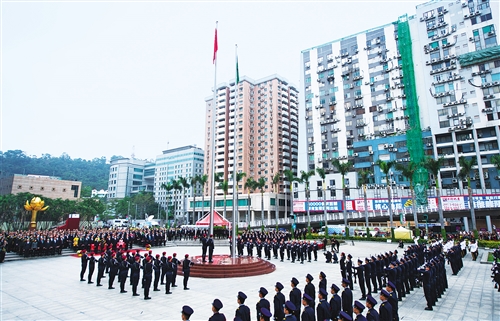 8时整,澳门警察乐队奏响雄壮的国歌,升旗台两侧来自澳门当地的中学生伴随着乐队旋律高声唱起了《义勇军进行曲》,全体观礼人士面向旗杆肃立。鲜艳的五星红旗和澳门特区区旗伴着朝阳徐徐升起,在微微的晨风中飘扬。