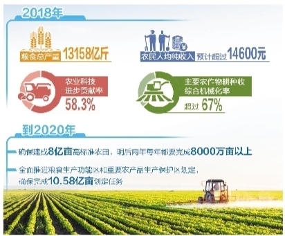 2018年,我国划定粮食生产功能区和重要农产品生产保护区9.3亿亩,全年新建高标准农田8200万亩,高效节水灌溉面积超过2000万亩,农机深松深翻整地超过1.5亿亩。加快现代种业发展,推进粮油糖、果菜菌等15个重要作物良种联合攻关,划定国家南繁科研育种保护区26.8万亩、核心区5.3万亩。强化政策支持,完善玉米、大豆生产者补贴,启动实施稻谷补贴,将3大粮食作物制种保险纳入中央财政补贴。