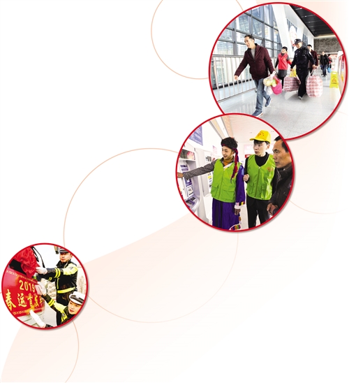 1月23日,江西冶金职业技术学院的志愿者次仁顿珠(左)与同学在新余北站帮助旅客通过自助购票机购票。春运启动以来,江西冶金职业技术学院组织师生开展春运志愿服务。凌厚祥摄