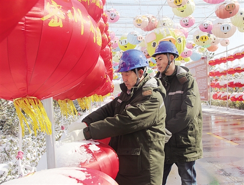 右图 2月3日,山东诸城市供电公司皇华供电所的工作人员在当地迎春灯会现场巡检。为保障节日用电,除夕夜山东电网将有9800余人值守。