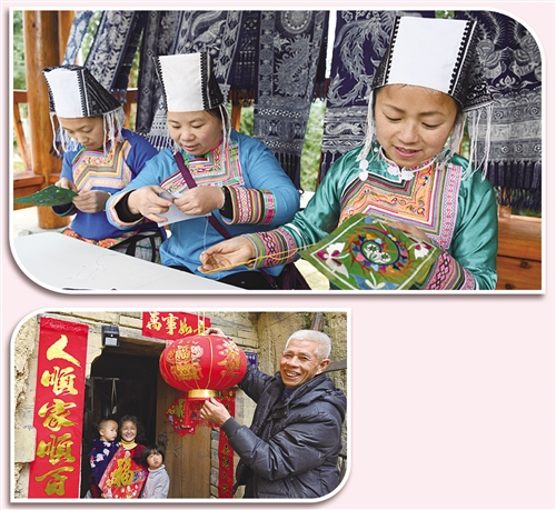 上图 贵州榕江县平江镇高鸟村积极开展产业扶贫,培训妇女通过蜡染、刺绣等“指尖经济”实现增收,于2018年底摘掉贫困村的帽子。图为高鸟村的苗族妇女在刺绣。 王炳真摄(中经视觉)