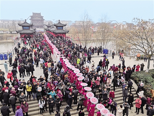 2月20日,安徽全椒县太平桥上演“正月十六走太平”民俗大戏。健步走、舞龙舞狮、花灯巡游等民俗表演、文体活动异彩纷呈。“正月十六走太平”是安徽全椒县独有的传统民俗,如今已成为当地全民健步走及民俗文化、商贸旅游的重要活动。本报记者 白海星摄