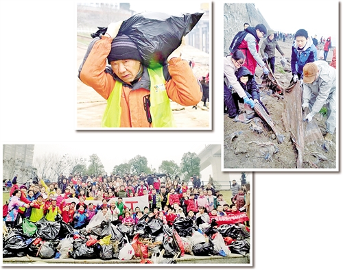 从农历腊月三十开始,“三峡蚁工”的志愿者每天在江边捡拾垃圾一个多小时,春节放假7天共有2500多人参与,捡拾垃圾约13吨。去年春节7天的活动有700多人参与,捡拾垃圾约18吨。