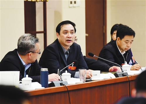 左图 3月6日,人大甘肃代表团审议政府工作报告,中国铁路兰州局集团有限公司党委书记、董事长杨伟军代表(中)发言时建议,中央财政应加大对中西部铁路建设支持力度,进一步为中西部经济社会发展提供支撑。本报记者 陈发明摄