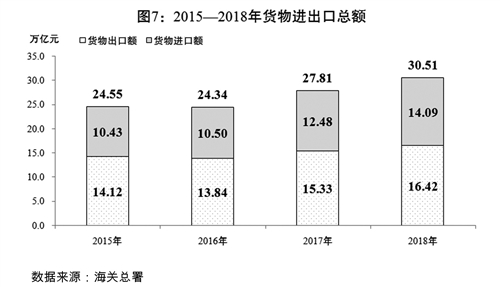 六是贸易强国建设扎实推进。首届中国国际进口博览会成功举办,向全世界宣示了我国主动开放市场、推动经济全球化的决心。区域全面经济伙伴关系协定谈判加速推进,与新加坡签署自贸协定升级版,与毛里求斯完成自贸协定谈判,累计已与25个国家和地区达成17个自贸协定,多双边经贸合作进一步深化。出台53项措施支持自贸试验区深化改革创新,在全国范围内复制推广30项自贸试验区改革试点经验。海南全岛自贸试验区启动建设,探索建设中国特色自由贸易港。新设一批跨境电子商务综合试验区,完善跨境电商零售进口监管和税收政策,扩大市场采购贸易试点范围,跨境电子商务、市场采购贸易等新业态新模式蓬勃发展。关税总水平由9.8%下调至7.5%,积极扩大进口促进对外贸易平衡发展。多元化市场不断拓展,全年货物贸易进出口总额达30.51万亿元,增长9.7%。