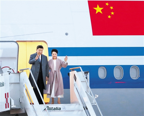 当习近平乘坐的专机进入意大利领空时,2架意大利空军战机升空护航。当地时间晚6时30分许,专机抵达罗马菲乌米奇诺机场。习近平和夫人彭丽媛步出舱门,礼兵敬礼致意,意大利农业旅游部部长等高级官员在舷梯旁热情迎接。习近平和彭丽媛沿红地毯前行。礼兵肃立在红地毯两侧,行注目礼。