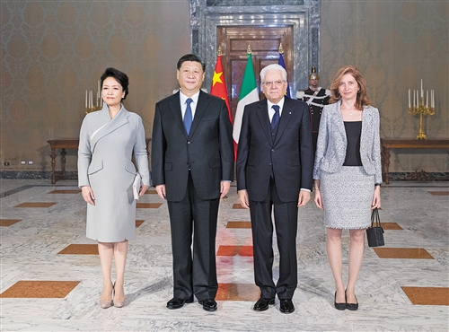 3月22日,国家主席习近平在罗马同意大利总统马塔雷拉举行会谈。会谈前,马塔雷拉总统为习近平举行隆重欢迎仪式。这是习近平和夫人彭丽媛同马塔雷拉总统和女儿劳拉合影。