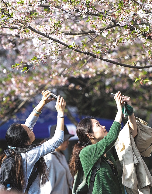 随着赏花人流,流入花海丛中。花为媒,新人浪漫诉衷肠,花枝前头表心迹。樱花季的婚纱照,已是年轻人一年的期盼。花为线,姐妹牵手俏花海。青春飞扬,欢乐如花,灿烂的笑脸,与花儿一起绽放。花为屏,衬美一对姊妹花。携手抚肩,情同手足,艳如红妆。花为饵,引来逐美的“摄郎”。一朵朵的娇嫩,一串串的红艳,一束束的绚烂,惹发了小哥的灵感。花为乐,静坐花台聆听。花开的声音,花落的声音,轻轻的,荡漾在心底。甜甜的,挂在嘴角间。花为歌,快乐的旋律弥在林中,轻轻的歌声响在心海里。花的心事,惹不住,溢出来,香了唇齿,乐了心田。
