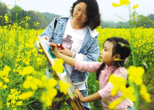 ▶江西省宜丰县桥西乡家庭农场油菜花基地,师生在写生。近年来,该县大力发展“油菜经济”,推动地方经济发展。 鲁红桃摄 (中经视觉) |