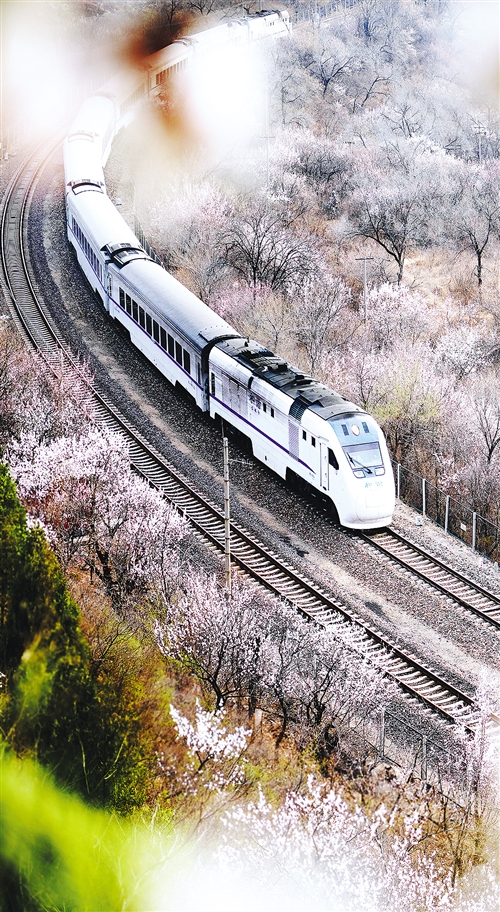 ◀北京市昌平区居庸关长城脚下,春花满山遍野,S2线和谐号列车行驶在花海间。 本报记者 翟天雪摄 |
