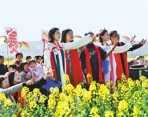 ▼陕西省汉中市洋县草坝村,当地诗歌爱好者在油菜花海中举办赛诗会。赛诗会已连续举办26年,成为当地一张亮丽的文化名片。 本报记者 高兴贵摄 |