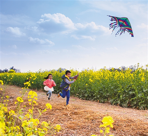 ▲四川省成都市双流区黄水镇,2名孩童在开心地放风筝。近年来,双流区着力打造农旅产业,助农增收。 柏长均摄(中经视觉) |