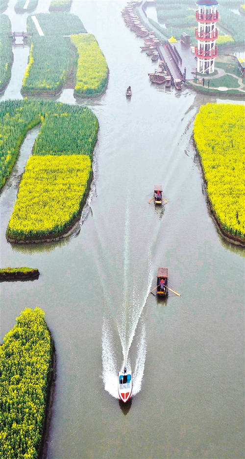 ▶江苏省兴化市千垛菜花景区游客乘船观赏油菜花。 汤德宏摄(中经视觉) |