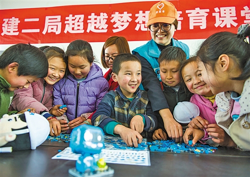 3月21日,四川省南充市仪陇县石板店村,中建二局的志愿者正在和孩子们玩游戏。近日,仪陇县“超越梦想培育课堂”启用,为包括留守儿童等孩子提供免费学业托管服务。 任思聪摄 (中经视觉)