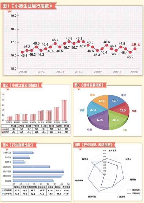 2019年3月份,“经济日报-中国邮政储蓄银行小微企业运行指数”(见图1)为46.4,较上月上升0.2个点,本月小微企业运行有所回升。