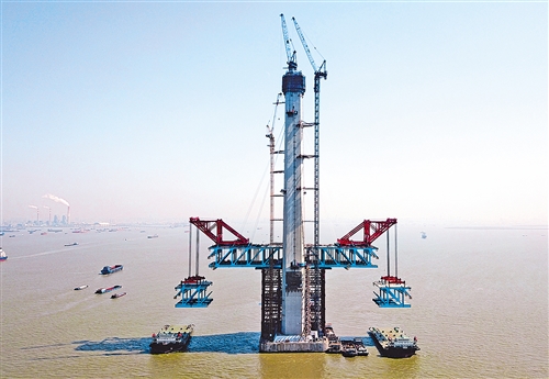 记者4月13日从中国高速铁路桥梁工程创新技术论坛上了解到,目前沪通长江大桥主航道钢梁架设完成近总量一半。预计2019年8月,沪通长江大桥北主塔将实现合龙,2020年建成。沪通长江大桥是沪通铁路的关键性工程和控制性工程,建成后将进一步完善区域交通运输结构,对促进长三角经济一体化进程具有重要意义。图为建设中的沪通长江大桥。