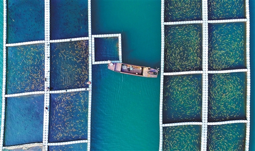 近日,渔民在湖南省资兴市东江湾冷水鱼养殖场喂鱼。