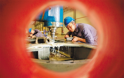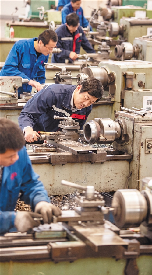 | ◀5月2日,位于山东省日照经济技术开发区的山东双港活塞有限公司工艺装备车间,全国五一劳动奖章获得者李为刚(中)带领“青年突击队”开展技术攻关。作为一线工人的李为刚曾先后获得国家实用新型专利7项,国家发明专利2项。 田 磊摄(中经视觉) |