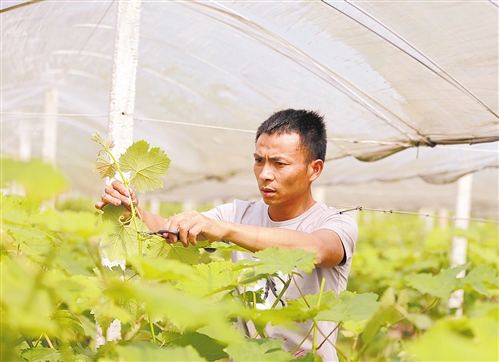 ▲5月2日,江西省吉水县醪桥镇西坑村生态家庭农场,刘国富在葡萄园剪枝。刘国富从北京返乡创办了国富生态家庭农场,带领当地百姓脱贫致富。 廖 敏摄(中经视觉) |