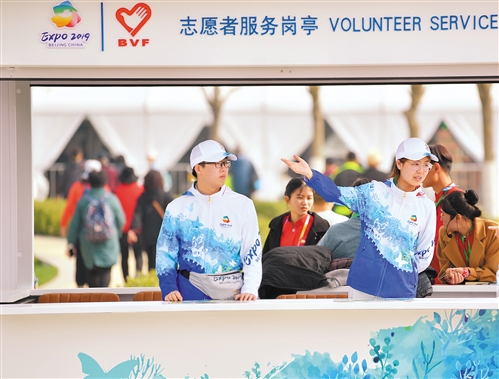 | ▶5月1日,北京世园会,来自北京邮电大学世纪学院的大学生志愿者徐小雯(右一)在为游客热情服务。本报记者 高兴贵摄 |
