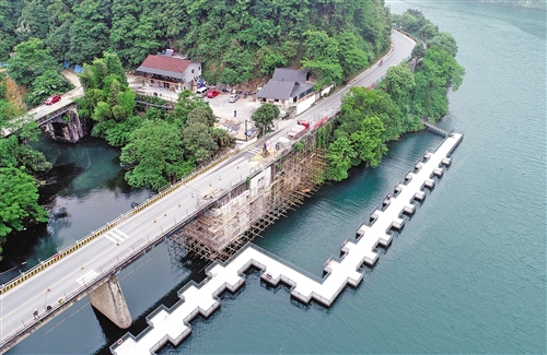 5月13日,工人在湖南省资兴市东清公路小东江二号桥进行加固施工作业,保障桥梁的完好、安全、畅通。该桥修建于上世纪80年代,是东江湖旅游区和6万库区群众出行的主要通道。朱孝荣摄(中经视觉)