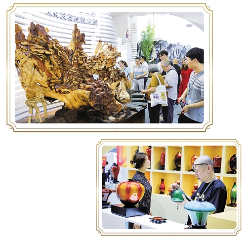 右图 第十五届文博会一号馆文化产业综合馆,观众仔细欣赏重庆展区展示的国家非物质文化遗产重庆漆器髹饰产品。